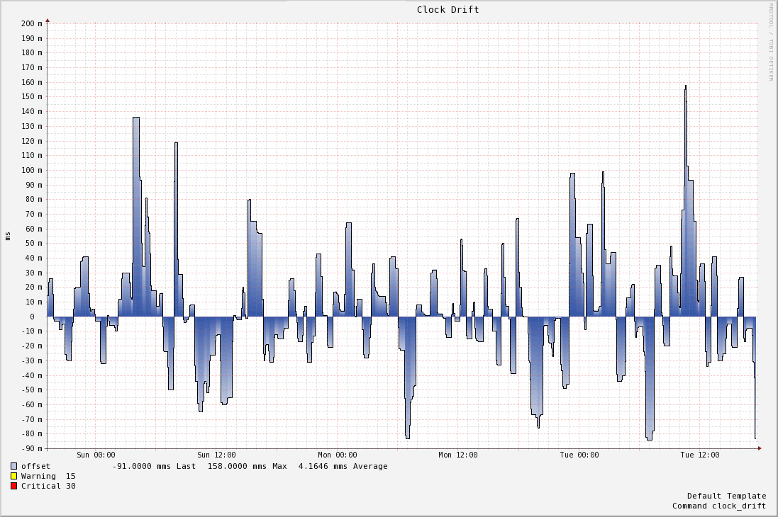 The actual leap second event over all was fine. For the NTP disciplined servers, the testing of our code held up and as expected, our platform stopped processing for 1 second until real time caught up with it’s view of time. If we look at the clock drift of one of our NTP disciplined servers at this time, there’s no perceivable clock drift after Sunday 00:00. Note the scale of the graph is “milli” milliseconds, so microseconds (the graphing engine that captured this leaves a lot to be desired):