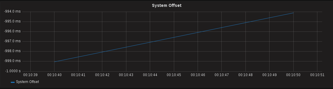 This is why the offset of em1 begins to track back into sync a little after 00:01:00. em2 and the System clock only begin to synchronise after 00:10:00, once em1 is LOCKED. Why are the NIC clocks synchronising faster than the System clock though? PTPd has the “clock:max_offset_ppm_hardware” setting which defaults to 2000ppm, which is also the daemon’s maximum. This means it will take 1000000/2000/60 = 8.33 minutes to correct one second of offset. However the System clock is a software clock, who’s rate is controlled by the “clock:max_offset_ppm” option which we specifically set to the maximum value of 1000ppm. The system clock should be recovering by 1ms every second but it’s actually taking 2 seconds to recover 1ms, clearly seen in the slope of the graph if you zoom in (see below):